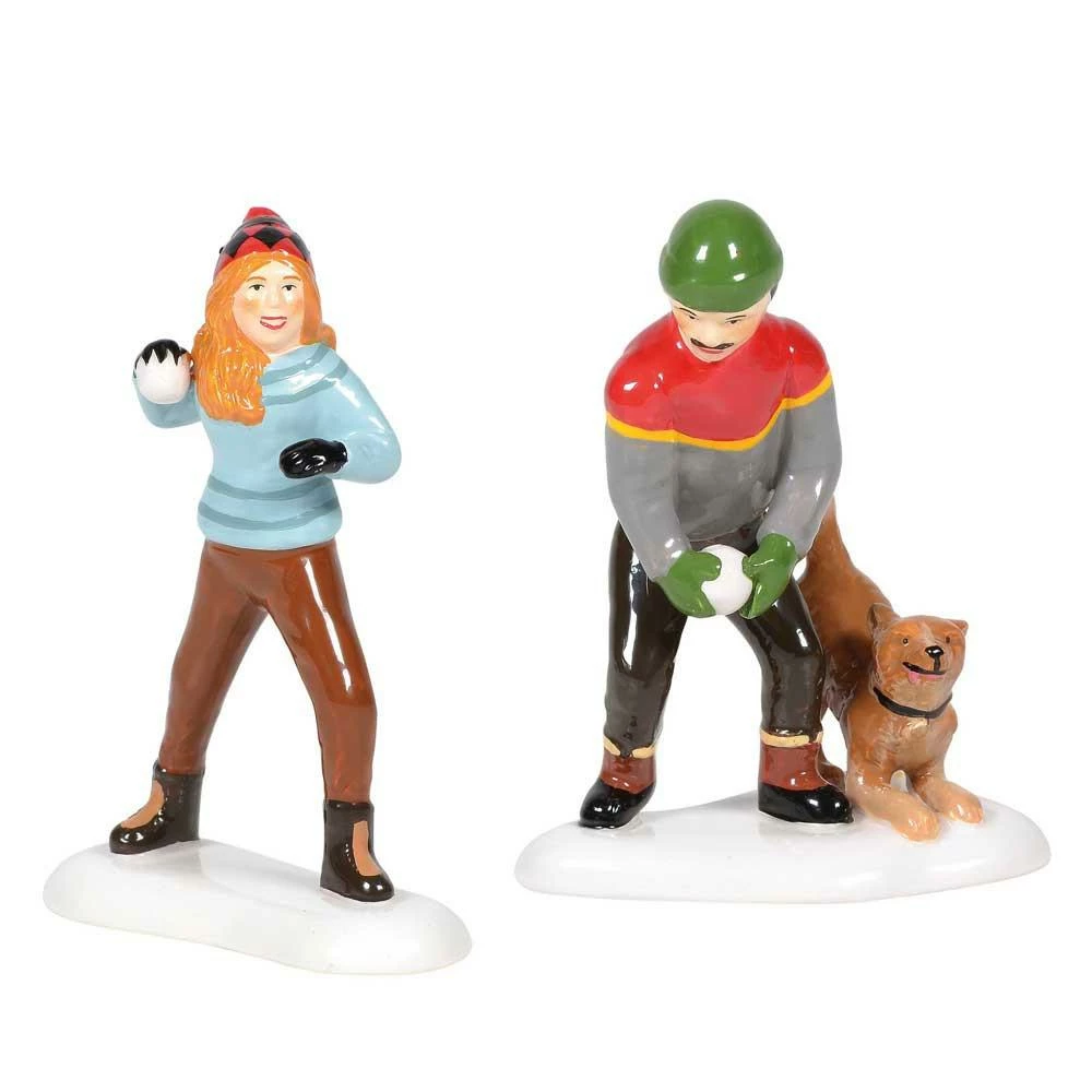 A coupleΒ with their dogΒ havingΒ a fun snowball fight.Β
