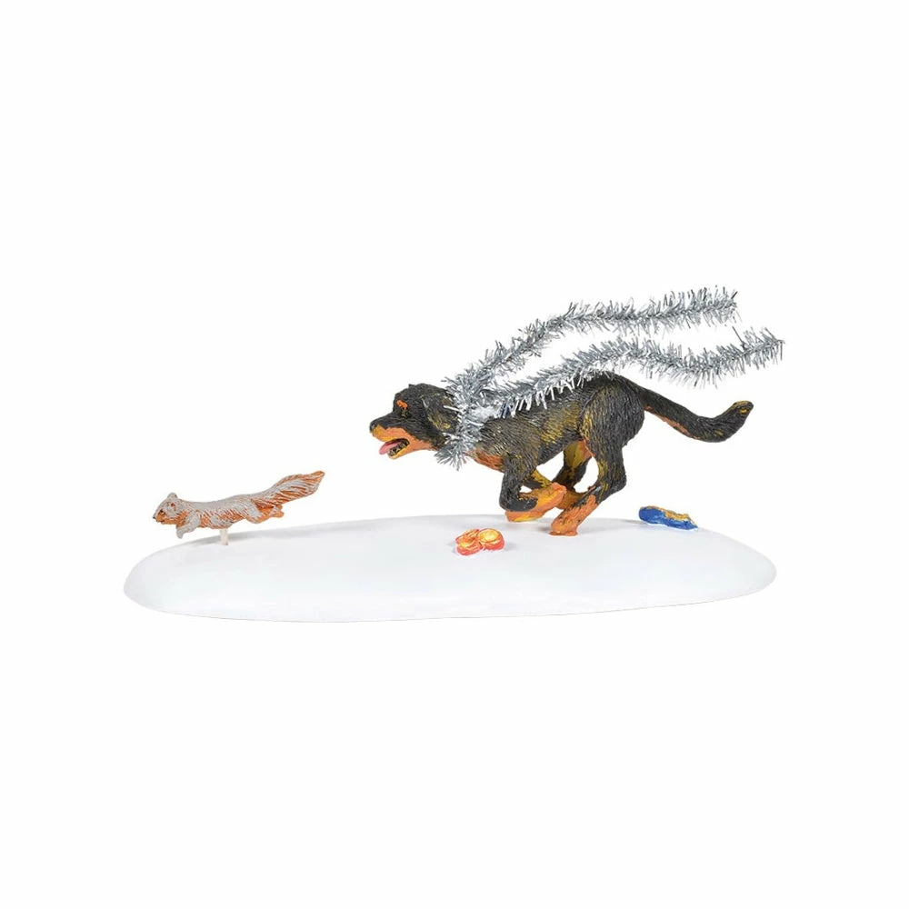 Inspired by the modern movie classic of the same name, enjoy these Village pieces and accessories that tell the story of the funniest Christmas vacation. This piece features Cousin Eddie’s Rottweiler, Snots chasing the squirrel that was stowed away in Clark’s Christmas tree.